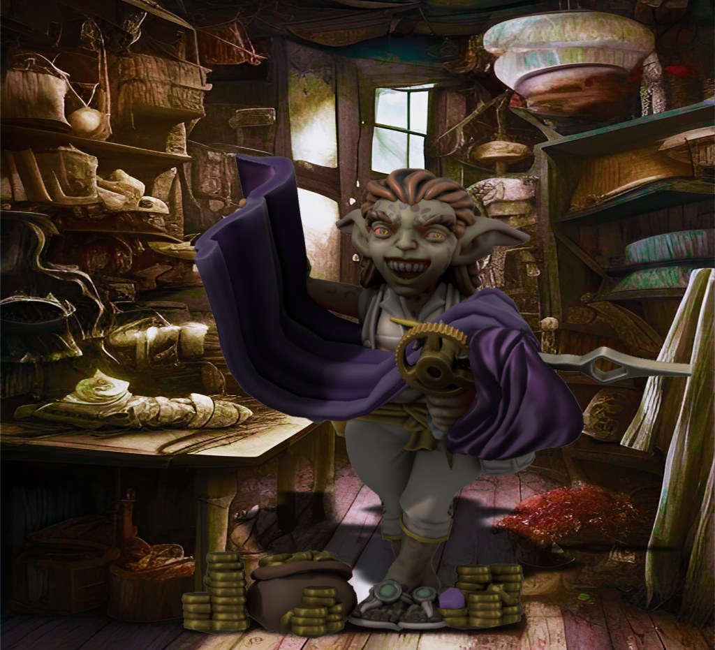 With our coin purses newly filled—one hundred gold pieces each from Lord Neverember as our reward for his Owlbear Lodge quest—our fellowship went together to browse Phandalin’s summer market. Curiosity brought us to a rather nondescript vardo owned by a flamboyantly dressed, golden skinned, pot bellied kobold merchantess. She introduced herself as Krisalee Tingletoe, and graciously invited us into her shabby little covered wagon.