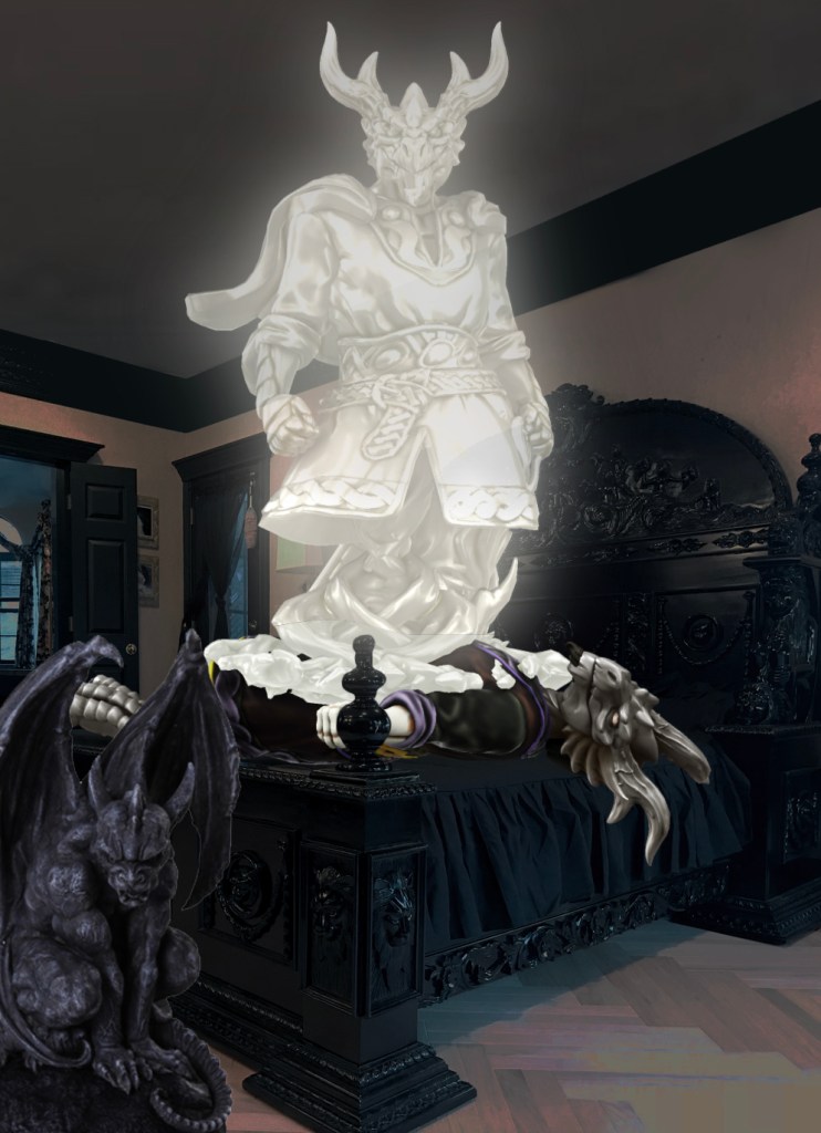 I then followed Jorad to the master bedroom, where we discovered the missing gargoyle, cowering at the bedside of its dead master, Lord Drachedandion, whose corpse lay in the bed. Suddenly, the ghost of Drachedandion arose, and demanded to know our intentions toward his manor and its marvelous contents. We assured the shade that his estate would pass to Din, and his draconic spirit was appeased. We brought the news and brass key and documents of ownership to the gobliness Din, who rewarded us all with twenty five gold pieces and fine bespoke garments for each cunt in our fellowship, and a new purple tunic for Krisalee Tingletoe.