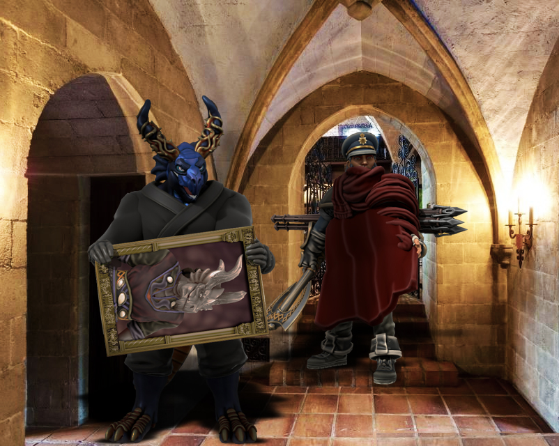 We mounted the stone steps of the manor, Tegan and Brick leading the way. I noticed one of the gargoyles flanking the steps was missing as we passed through the double doors into a luxurious foyer. As soon as Gunx entered, he was immediately entranced by a portrait of a silver dragonborn hanging in the entryway; presumably, Lord Drachedandion. He pulled the painting down to claim it as his loot, and inadvertently revealed a safe which had been hidden behind it. Tolarin joined his brother, and noticed the tell-tale marks of a safe-cracker’s tools. Equipped with lockpicks myself, I opened the safe only to discover an Ace of Diamonds playing card; evidently, the calling card of the halfling swindler.
