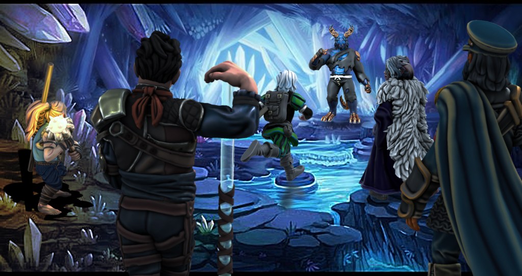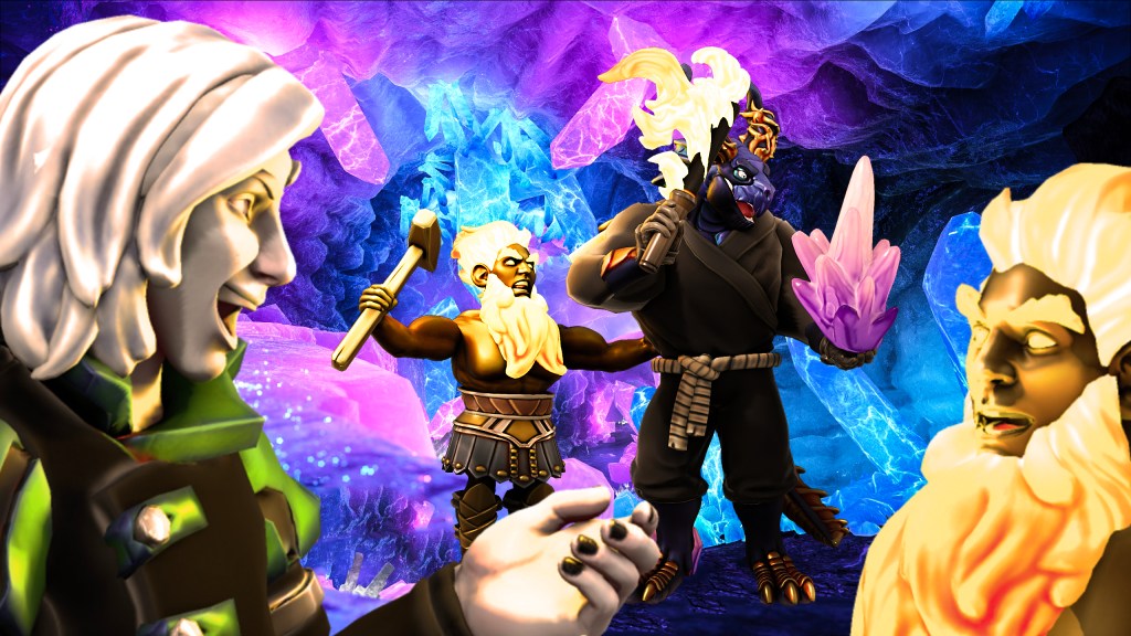This passage opened up to a large cavern where Gunx soon discovered a handful of what appeared to be flame-haired, brass-skinned, singing dwarves. They were mining away at dimly-luminescent crystals that seemed to have been intentionally ‘farmed’ into growth in this cave. These brazen miners noticed Gunx immediately, and tried to shoo him away with brusque gestures and gravelly grunts.