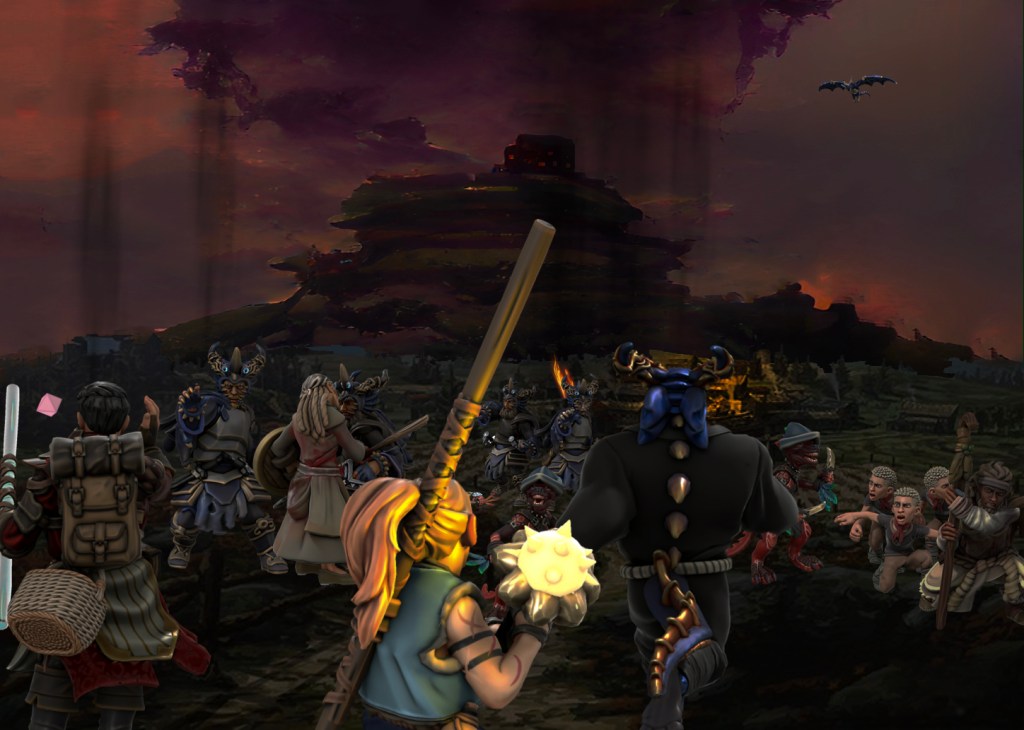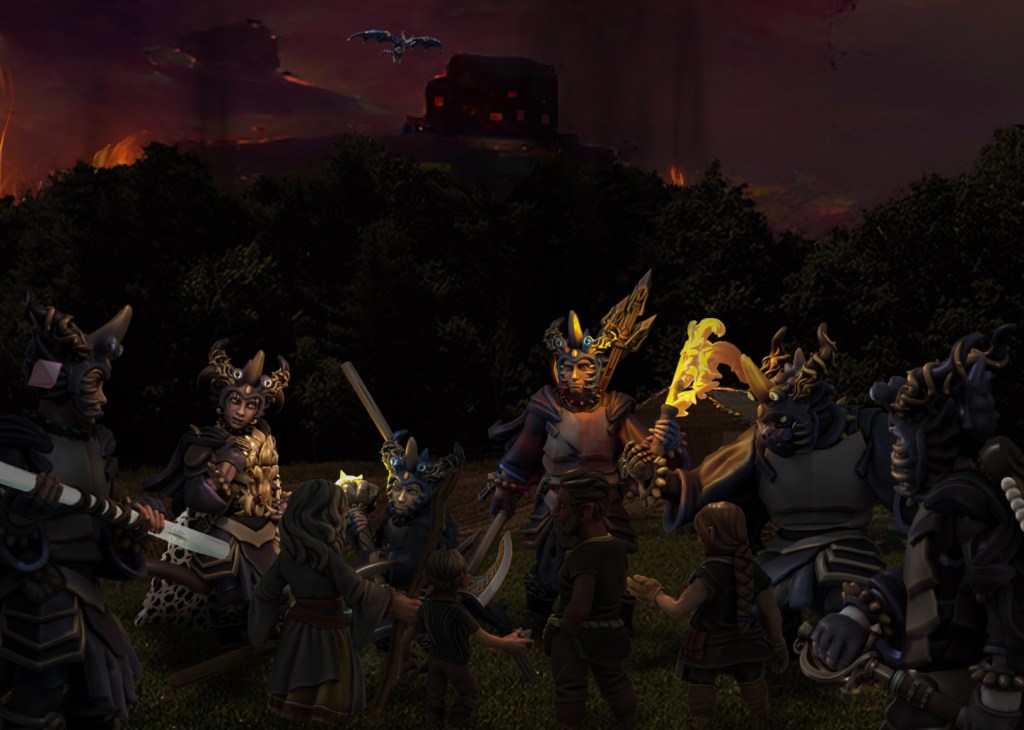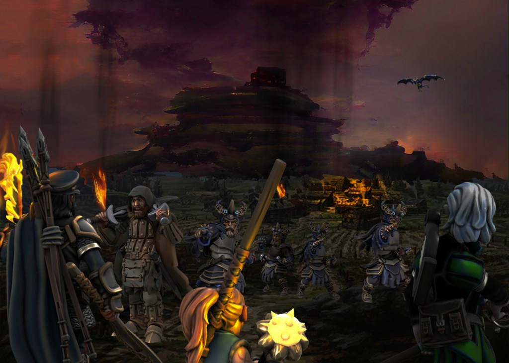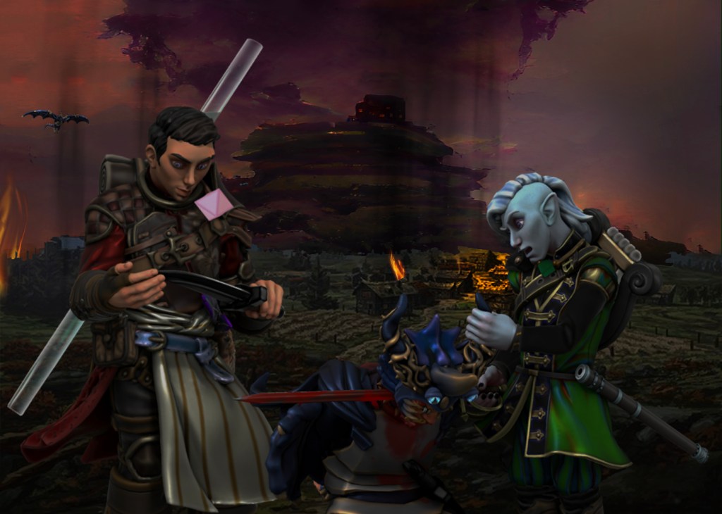 As we returned this evening around sunset, we were startled to see smoke rising from the village, and a dark, winged shape circling in the sky above: Phandalin was apparently under dragon attack! Our fellowship followed fleet-footed Gunx into town, where we quickly encountered a fearful family fleeing from a band of brigands. The dragon’s destruction was evidently being abetted by human dragon-cultists and a cutthroat kobold cohort.