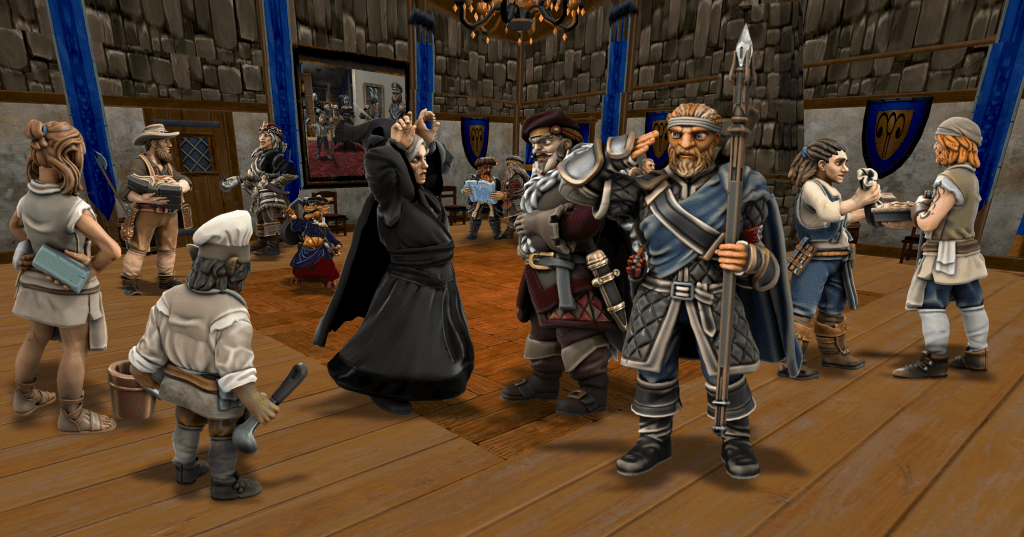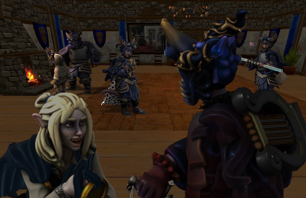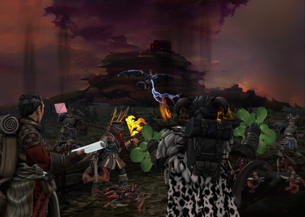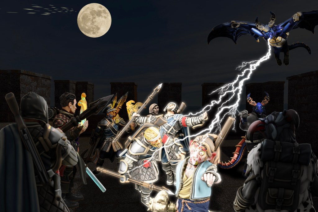 Inside, we discovered two thirds of the citizenry had taken shelter here, and Brick spotted his trusty Sergeant Guth, and eight more of his men from the Phandalin Guard. Together, the guards and my fellow cunts mounted the manor’s roof turret to assess the battle. Immediately, we were blasted by the lightning breath of a blue dragon, dropping Tolarin, Sergeant Guth, and a guardsman. Gunx revived his brother with a potion, and the weakened halfling monk pulled himself and the unconscious sergeant back down the hatch to safety.