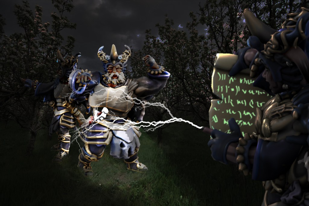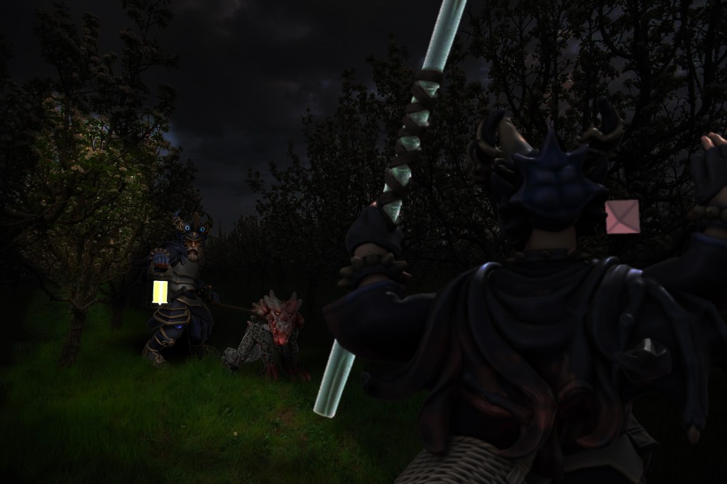 We encountered four more toothless local serfs, whom we instructed to head for shelter in the manor. We made our stealthy way through Edermath’s accursed orchard, until we ran into another group of raiders: an armoured warrior, four more cultists, and two drakes. The warrior shot Jorad with his crossbow, and Jorad retaliated with a Hellish Rebuke. The cultists cast Hold spells on the rest of the cunts, catching Brick and Tolarin in their magic snare. Tegan Shattered three of the cultists, and Brick shook off their magic, but Tolarin remained held fast. I hit one drake with a Poison Spray, while Gunx smashed another.