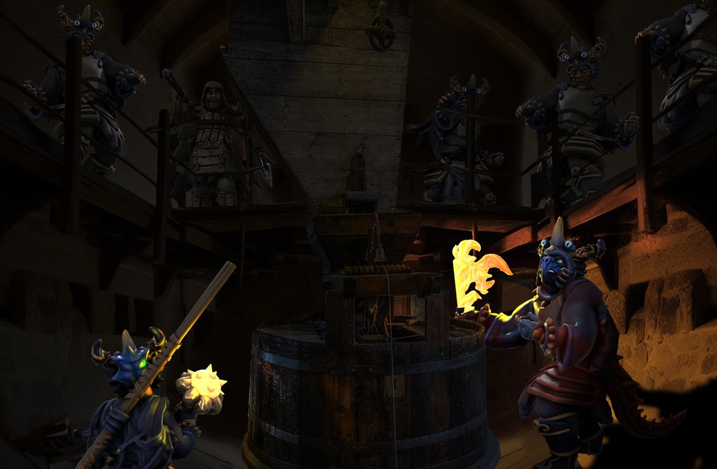 We put out the remaining fires, but could not help but notice how half-assed this whole arson attempt appears. With Tegan at my side, I burst the door open, ready for anything, but the room appeared quiet, empty… and highly suspicious. As Brick wondered aloud, “What are these kobolds about?” I pulled out another scroll, and cast an Augury. Indeed, the omens plainly pointed to woe: there was a hidden danger here. Fearless, the monks entered first, and flushed out five fighters, and five fanatics, lying in wait on the loft level. Gunx leapt up to the loft, and blasted the foes with lightning breath, to give them a firsthand taste of the draconic power they so admire. Brick hauled himself up on the other side of the room, and hacked down a cultist. Tegan, from the doorway, Shattered a quarter of the catwalk, killing a number of villains in a masterpiece of violence. Tolarin and Brick skillfully executed the remaining raiders.