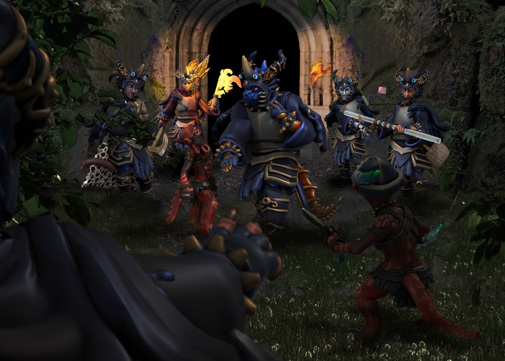 We came to the Alderleaf farm, where the house was abandoned, but in the field we found the farmer and her son, with two more halfling villagers. These hobbits warned us that the area around the manor was swarming with cultists and kobolds, and perhaps there’s a dragonborn among them as well. We decided to dress in the garb of the cultists, and approach the Doom Grotto, in order to enter the manor from below. With Gunx in the lead, we bluffed past the posted sentries, and made our way through the tunnel and into the manor.