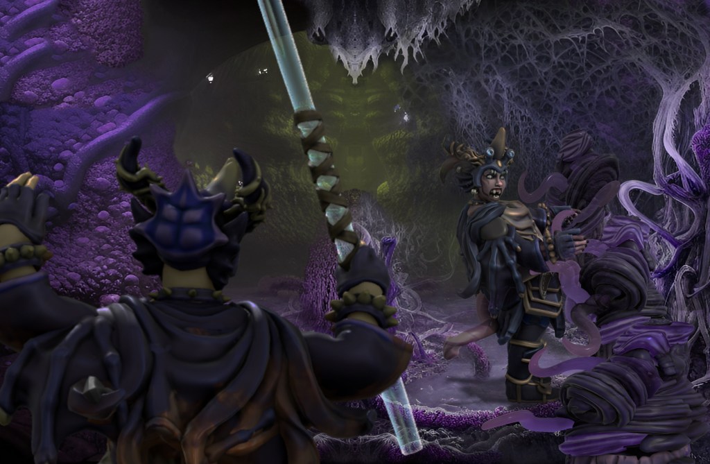 Jorad led us past these fresh corpses, down a set of natural stairs, to a moist cavern carpeted with fungal growths. I took the lead, and as I strode through the mycobiota I was stung by the ferocious tendrils of a necrotic fungal colony. I killed one with acid, but more appeared. The other cunts came to my aid, blasting and hacking at the malicious mushrooms, and soon we had broken through yet another line of the cult’s confounding defenses.