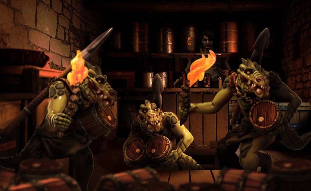 I continued my sleepless watch well into the night, until I heard a creak, a clunk, then hissing whispers and the blaze of torchlight. Eight lizardfolk emerged from a trapdoor hidden beneath a dummy chest. I magically disguised myself as Bog Luck, but I stayed hidden as I watched the reptilian crew take all the cultists’ loot down the hatch. Once their torchlight had faded, I pursued, and reconnoitered some distance down a twisting, wet tunnel before deciding to head back to the vault for a half-night’s rest.