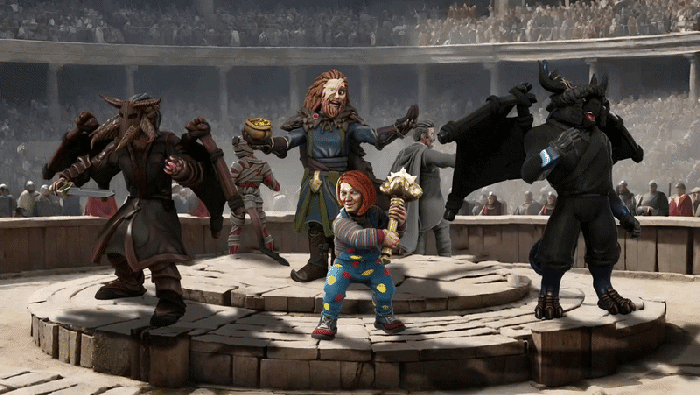 Tegan, in the comical guise of Dagult Neverember, led our fellowship, dressed as a coterie of monsters, into the centre of the arena, to joyous howls of anticipation from the assembled crowd. Suddenly, magical barriers split the battleground into four quadrants, and in each of these, an elemental adversary appeared. Tegan and I faced off against Earth, while the other cunts faced Fire in the adjacent cell. For the time being, Water and Air could do nothing but wait in their own cells.