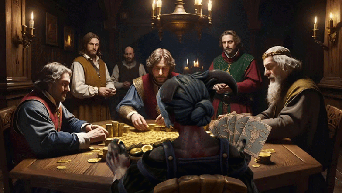 While my fellow cunts mingled with these pompous aristocrats, I slipped through the banquet hall and kitchens, down a set of stairs, followed by Gunx and Tolarin. I found a handful of nobles playing cards, so I sat in for a hand, and naturally, won the pot, thanks be to Beshaba.
