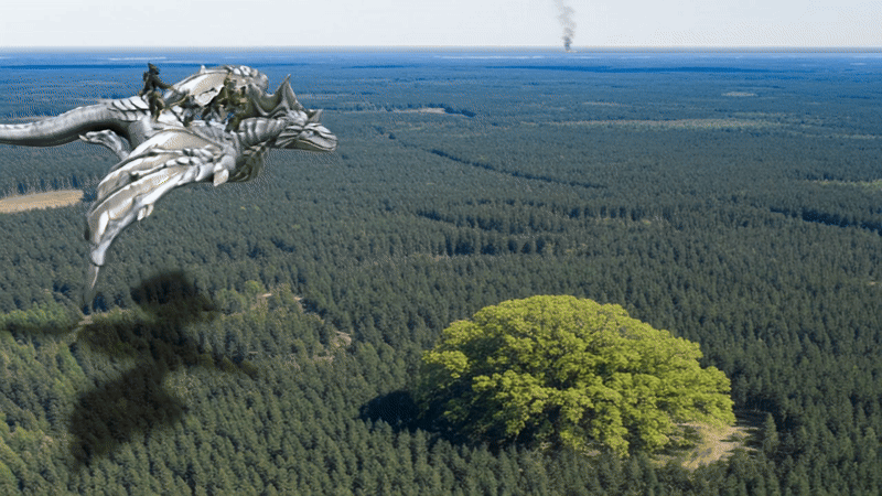 Early this morning, we set off once again to the northeast on the shining silver back of Otaaryliakkarnos, as Lathander’s rosy fingers tickled the treetops of the High Forest. Our flight path took us directly over Noanar’s Hold. To the west, suspicious smoke rose near the settlement of Calling Horns, where Jundar’s Pass meets Evermoor Way. To the east, The Grandfather Tree, a monstrous oaken behemoth, towered above all the trees of the High Forest. Why the first burns, while the second still stands?… only Beshaba knows.
