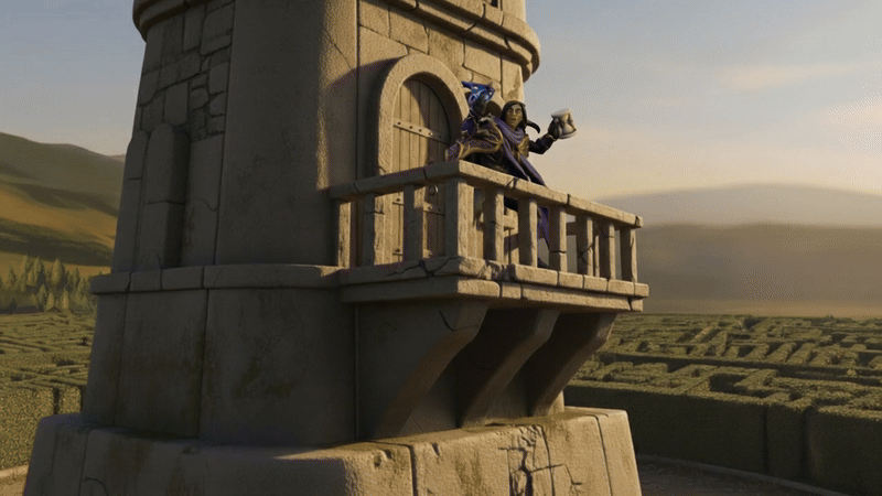We entered the hedge maze surrounding Xonthal’s Tower; clearly, an extradimensional space of some sort. Evidently, our approach had already been spotted: a human mage in dark purple robes, presumably Iskander, appeared on a tower balcony, waving the blue mask and a white hourglass at our fellowship, yelling like a damned fool. Someone came out and attacked him, but Iskander knocked his attacker over the edge, and dashed back inside the tower. It all seemed a bit suspiciously dramatic to me.