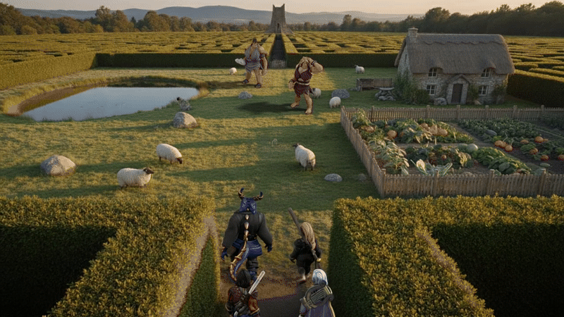 Once again, we returned to the sundial, and now shadows pointed in four different directions. We chose a path at random, and came to a boulder strewn farmyard. A pair of cyclopes women in the yard seemed friendly, so Tegan cast a Comprehend Languages spell to understand them. Evidently, they wanted one of our party to engage in a boulder throwing contest with them. Thank Beshaba, Gunx being equipped with a belt of hill giant strength allowed us to pass this challenge easily.