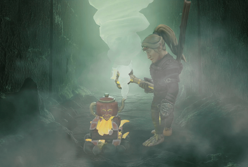 Soon, the others joined me, and we now saw this gnomen had shadows pointing in eight different directions, one at each of the eight paths. Bewildered, we picked a path at random, and came to a placid pond, with a stout pagoda built onto a boulder island, with a little bridge running to it. Inside this sat a man in silk robes, playing a stringed instrument. Hoping this would be another friendly encounter, we approached the man on his little island. He began to prepare tea, or so I thought. Suddenly, our host disappeared, and the pagoda turned into a sealed stone cell, filling with poisonous vapour.