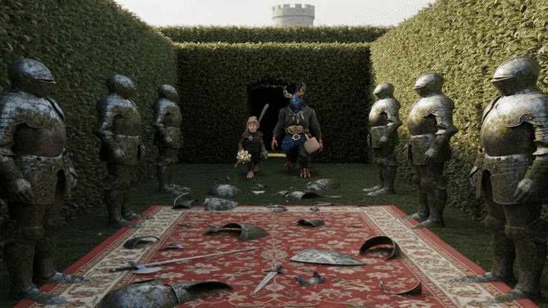 Back at the sundial once more, we picked another random direction, and came to a carpeted clearing guarded by standing suits of armour. These came to life as we tried to pass, and the more we destroyed, the more seemed to reassemble themselves from the wreckage. Finally, a few of the suits dropped garnet gemstones, and we were able to collect these, and make it back to the sundial again. I don’t know if it was frustration or inspiration that led me to jump up onto the sundial, but when I did, I suddenly shifted to a new sundial.